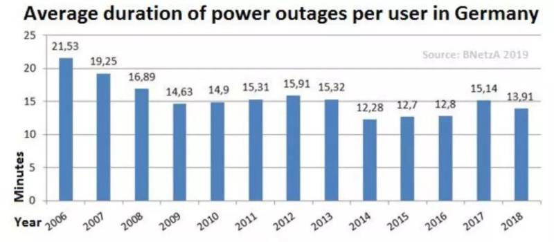 根據(jù)德國聯(lián)邦網(wǎng)絡(luò)局(BNetzA),德國每位用戶的平均停電時間從2006年的21.53分鐘以上減少到2018年的13.9分。BNetzA表示:“能源轉(zhuǎn)型和分散發(fā)電的份額不斷增加,對供應(yīng)質(zhì)量沒有任何負(fù)面影響?!盉NetzA的分析記錄了持續(xù)超過三分鐘的所有停電情況,2018年總計有167,400次停電,這是自記錄保存以來的第二低值。