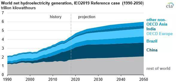 ——由于增長緩慢,水電在可再生能源發(fā)電中的份額從2018年的62%下降到2050年的28%,這是因?yàn)榻?jīng)合組織國家的資源有限和許多國家的環(huán)境問題限制了新的中型和大型水電項(xiàng)目的數(shù)量。
