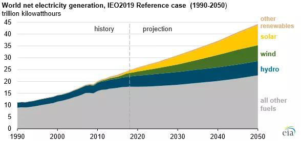 中國儲能網(wǎng)訊:2018年全球28%的電力來自可再生能源,其中大部分(96%)來自水電、風(fēng)能和太陽能技術(shù)。美國能源信息署(EIA)日前發(fā)布《2019年國際能源展望》預(yù)測可再生能源(包括水力發(fā)電)是2018年至2050年期間增長最快的發(fā)電來源,平均每年增長3.6%。到2050年可再生能源將占全球總發(fā)電量的49%。