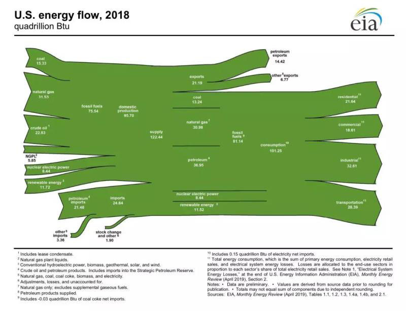 根據(jù)美國能源信息署發(fā)布的2018年美國能流圖,2018年美國能源消費101.25夸德(Quads,1夸德大約相當于2500萬噸標準油當量),其中80.1%來自化石能源(煤炭13.1%、天然氣30.6%、石油36.5%);核能占8.3%;可再生能源占11.4%。