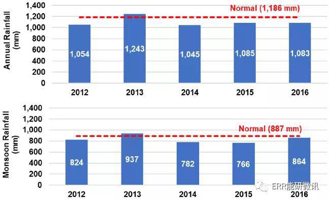 3.水供應(yīng)下降。印度各地的地下水位正在下降。自2012年以來,全國年降雨總量和季風(fēng)降雨量均低于正常水平(除2013年外)。這是對(duì)煤電生產(chǎn)的一個(gè)重大威脅,煤電生產(chǎn)需要大量的水用于蒸汽生產(chǎn)和冷卻,而且由于水供應(yīng)已經(jīng)導(dǎo)致多個(gè)電廠多次發(fā)電量下降。