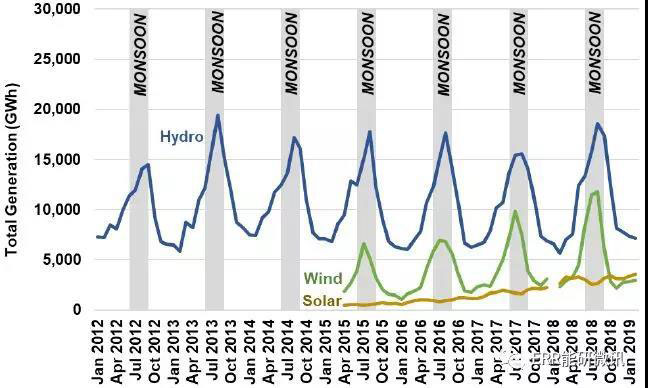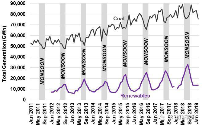 2.來自低成本可再生能源與煤電之間的競爭日益激烈,特別是在季風(fēng)季節(jié)。由于可再生能源愈發(fā)廉價(jià),在與之的競爭中,煤電在印度能源市場上越來越缺乏競爭力。在季風(fēng)季節(jié),低成本的可再生能源具有特別的優(yōu)勢。風(fēng)能和水電可以對(duì)煤電發(fā)電量驟降的情況進(jìn)行補(bǔ)充,提供了一個(gè)抵消峰值。