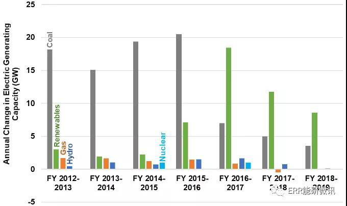 印度年度裝機(jī)容量變化,按來源劃分(從2012~2013財(cái)年到2018~2019財(cái)年)