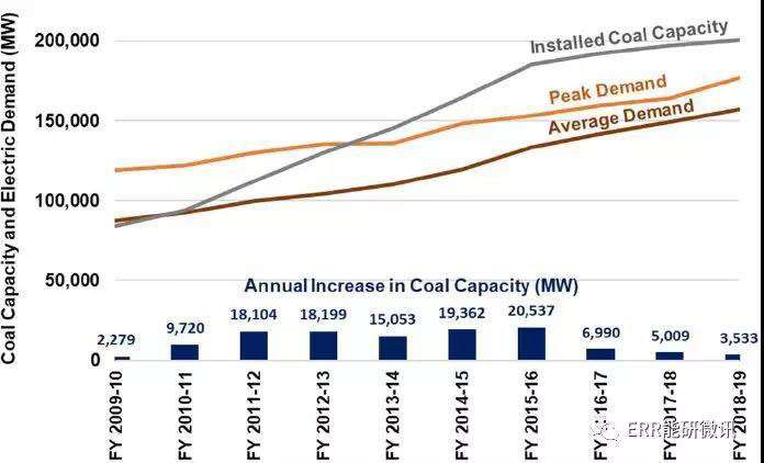 印度累計(jì)煤電裝機(jī)容量、新增煤電裝機(jī)容量、峰值電力需求和平均電力需求