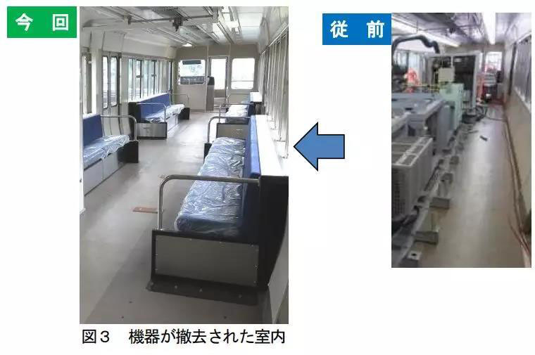 該列車將客艙內(nèi)搭載的主要機(jī)器移設(shè)到地板下,通過增加燃料電池模塊的輸出密度來縮小設(shè)備的尺寸。與普通火車一樣,在列車的的車廂中安裝了長座位。