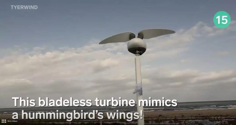 15. 這個(gè)無(wú)葉片渦輪機(jī)模仿了蜂鳥的翅膀!Tyer Wind Converter使用拍打動(dòng)作而不是旋轉(zhuǎn)刀片。它沒(méi)有葉片式渦輪機(jī)那么強(qiáng)大......但是尺寸越小,它就越適合人口稠密的地區(qū)。
