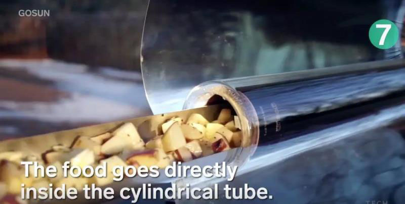 7. GoSun Grill使用陽(yáng)光供電。反射器將太陽(yáng)的光線聚焦在金屬管上......產(chǎn)生高達(dá)550°F的烹飪溫度。食物直接進(jìn)入圓柱形管內(nèi)。