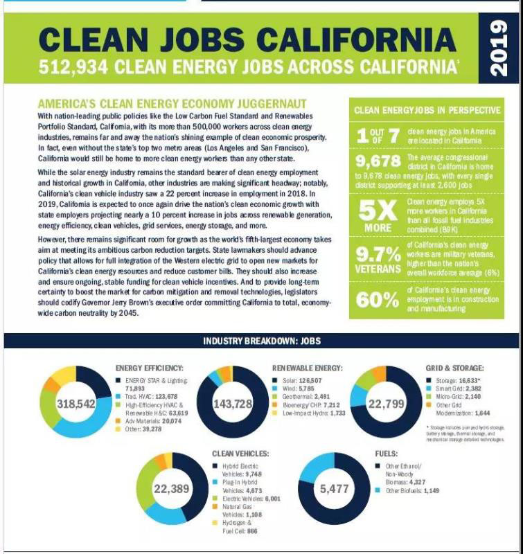 ——在全州范圍內,2018年清潔能源行業(yè)共有512,934個就業(yè)崗位。其中包括可再生能源就業(yè),如安裝太陽能和風能;建設電動和混合動力汽車;在建筑物中進行能源效率工作;制造清潔燃料和建設電池存儲項目。