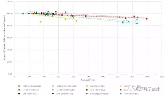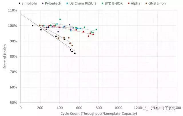 1000次實驗:如下圖所示,中國的Alpha ESS衰減有些快,比亞迪的LFP表現(xiàn)在這個階段是很不錯的。