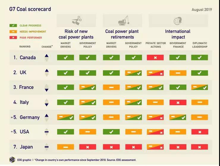英國非政府組織E3G評(píng)估G7各國的煤電政策,從是否會(huì)上新的煤電(市場(chǎng)驅(qū)動(dòng)力、政府政策)、既有煤電退役速度(市場(chǎng)驅(qū)動(dòng)力、政府政策)以及國際影響(私人部門行動(dòng)、政府資金、外交領(lǐng)導(dǎo)力)三個(gè)維度的7個(gè)指標(biāo)打分,結(jié)果如下表所示: