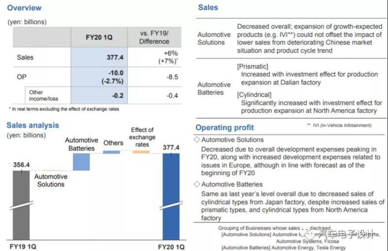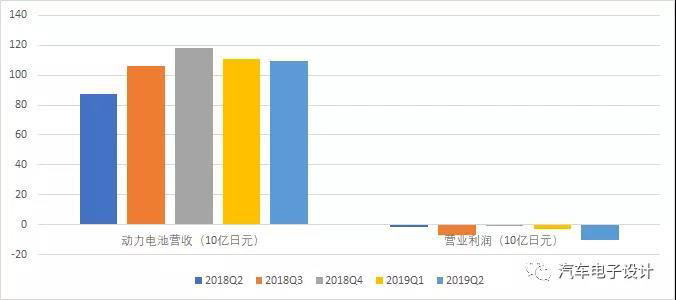 松下2019 的業(yè)績情況,汽車業(yè)務整體營收 3774 億日元,營業(yè)利潤虧損 100 億日元,虧損同比擴大 5.7 倍。汽車業(yè)務中動力電池業(yè)務營收 1092 億日元,同比增長25%,環(huán)比下降1.5%。