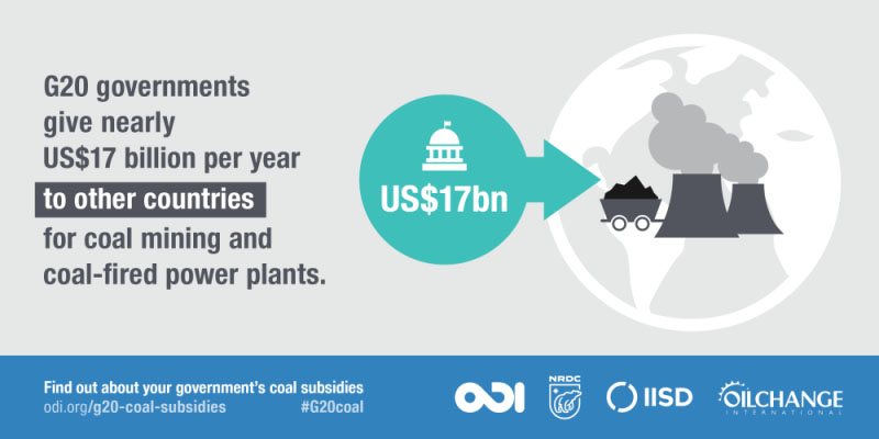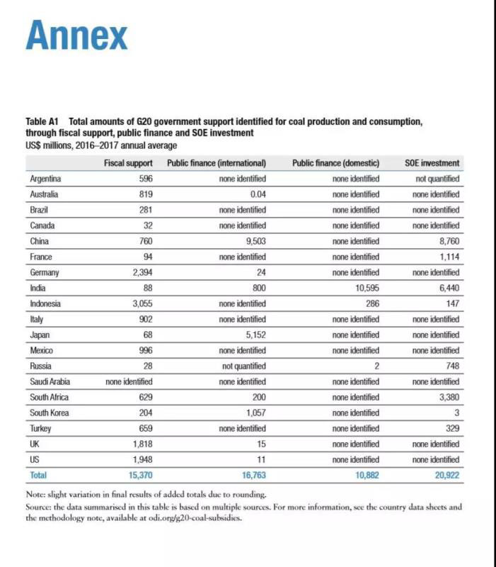 在G20各國中,中國對與煤炭領(lǐng)域支持力度最大,2016-2017年的資金支持達(dá)到平均每年189.15億美元,涉及煤炭生產(chǎn)(19.75億美元)、煤電(168.70億美元)、消費(6800萬美元)、煤炭轉(zhuǎn)型(200萬美元)。在對煤電的資金支持中,大約95億美元用于支持海外的煤電項目。