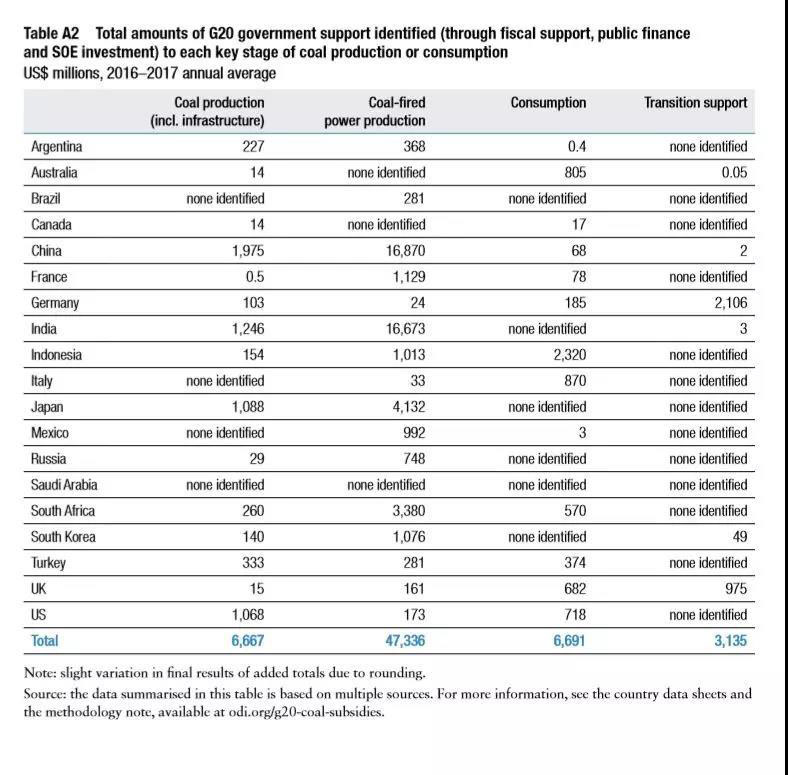 中國儲能網(wǎng)訊:英國智庫ODI發(fā)布研究報告,2016-2017年間G20各國整體對于煤炭領(lǐng)域的資金支持達(dá)到平均每年638.29億美元,涉及煤炭生產(chǎn)(66.67億美元)、煤電(473.36億美元)、消費(66.91億美元)、煤炭轉(zhuǎn)型(31.35億美元)。