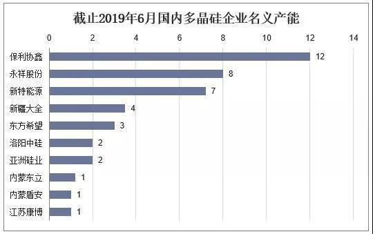 截止到2019年6月底,國(guó)內(nèi)多晶硅企業(yè)名義產(chǎn)能超過(guò)萬(wàn)噸級(jí)別的有保利協(xié)鑫12萬(wàn)噸,新特能源7.2萬(wàn)噸,永祥股份8萬(wàn)噸,新疆大全3.5萬(wàn)噸,洛陽(yáng)中硅2萬(wàn)噸,亞洲硅業(yè)2萬(wàn)噸,東方希望3萬(wàn)噸,內(nèi)蒙盾安1萬(wàn)噸,江蘇康博1萬(wàn)噸,內(nèi)蒙東立1.2萬(wàn)噸,十家產(chǎn)能共計(jì)40.9萬(wàn)噸/年,約占國(guó)內(nèi)總產(chǎn)能的94.5%,頭部企業(yè)的市占率在穩(wěn)步提升。預(yù)期到2019年年底,國(guó)內(nèi)多晶硅產(chǎn)能將達(dá)到將達(dá)到53.8萬(wàn)噸/年,主要增量來(lái)自下半年大全新能源3.5萬(wàn)噸產(chǎn)能,東方希望5萬(wàn)噸產(chǎn)能,天宏瑞科1萬(wàn)噸產(chǎn)能,其他產(chǎn)能1萬(wàn)噸的擴(kuò)產(chǎn)。