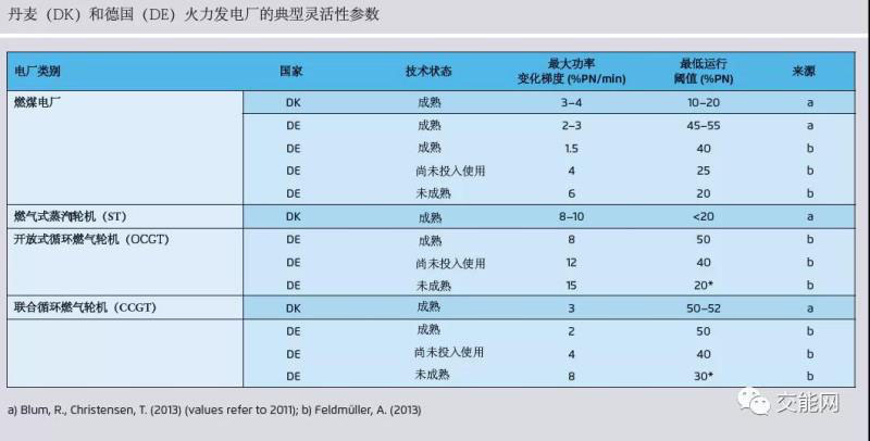 下表概述了基于不同來源的丹麥和德國(guó)發(fā)電廠的靈活性參數(shù)(Blum,R.,Christensen,T。(2013),F(xiàn)eldmüller,A。(2013))。與燃煤發(fā)電廠相比,燃?xì)獍l(fā)電廠的靈活性通常更高。開放式循環(huán)燃?xì)廨啓C(jī)(OCGT)和燃?xì)馐秸羝啓C(jī)(ST)在靈活性方面優(yōu)于聯(lián)合循環(huán)燃?xì)廨啓C(jī)(CCGT)。從下表可以看出,在所有考慮的類別中,丹麥發(fā)電廠的靈活性平均比德國(guó)發(fā)電廠更高。
