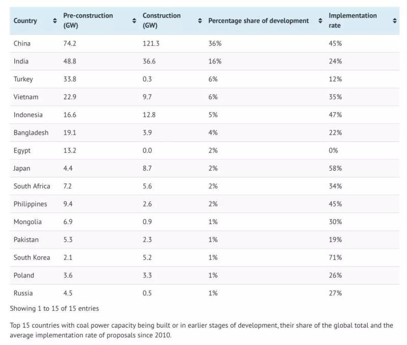 從正在建設(shè)和規(guī)劃的煤電產(chǎn)能來看,新增煤電也將集中在15個(gè)國家(486吉瓦),占全球目前正在開發(fā)的所有煤炭產(chǎn)能(538吉瓦)的90%: