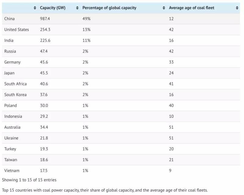 到2019年6月底止,在全球范圍內(nèi)煤電裝機(jī)主要集中在15個(gè)國家(1845吉瓦),占全球總裝機(jī)(2027吉瓦)的91%。這15個(gè)國家和地區(qū)是: