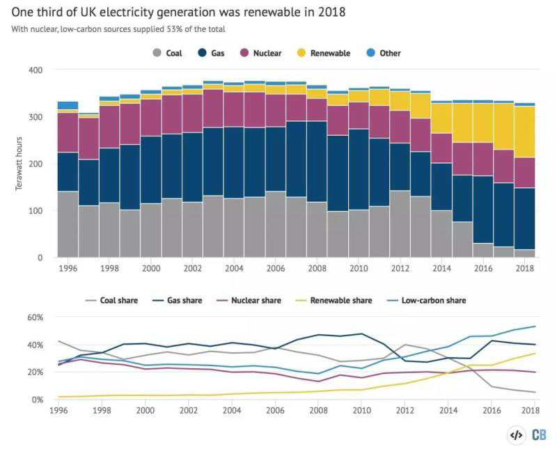根據(jù)英國Carbon Brief的數(shù)據(jù),2018年英國發(fā)電量中各類能源比例如下: