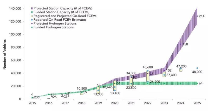 (當前加州燃料電池汽車與規(guī)劃部署規(guī)模對比)
