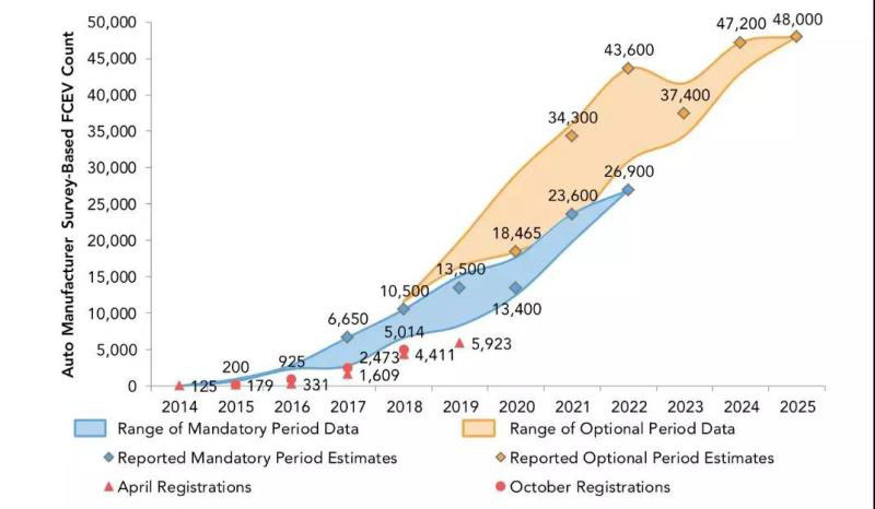三、汽車制造商對燃料電池汽車的部署落后于EO B-48-18和CaFCP Vision中的設定目標。目前,加州擁有5,923輛燃料電池汽車,較去年同期增加了1,500輛,短期內需要提速。畢竟,這一數據與2017年386%和2018年174%的增速不可同日而語,與2022年2.69萬輛和2025年4.8萬輛的預期目標更是相去甚遠。