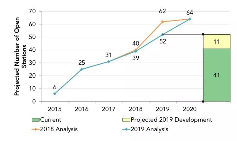 二、2018-2019年加氫網絡建設基本上按計劃實施。2020年6月前,將開放11個加氫站,屆時合計擁有52個加氫站,略低于此前預計的2019年底62個加氫站運營的目標。但所有64個受資助的加氫站預計仍將在2020年底前開放,甚至將提前建成。
