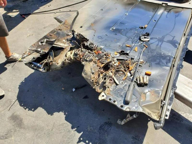 事故中的Model 3以高速撞向電線桿,強(qiáng)大的沖擊力使得電池板出現(xiàn)了巨大的凹陷和變形,兩個(gè)電池模組被解體,其中一個(gè)受損較重的模組中的電池出現(xiàn)了溫度升高的情況,并開始溶解隔熱涂層,而由于隔熱涂層的在溶解的過程中的降溫作用,電池并沒有出現(xiàn)進(jìn)一步的惡化情況。