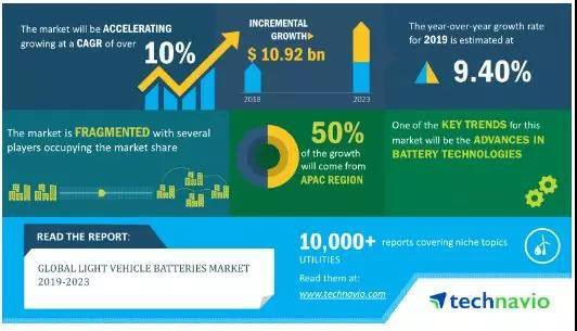 根據(jù)全球研究機構(gòu)Technavio的報告透露,2019-2023年期間,全球輕型汽車電池市場規(guī)模將增長109.2億美元,復合年增長率超過10%。