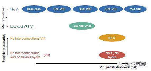 本研究旨在評估替代性低碳電力系統(tǒng)的成本,該系統(tǒng)能夠?qū)崿F(xiàn)嚴(yán)格符合《巴黎協(xié)定》的碳減排目標(biāo)。因此本文比較了具有代表性的經(jīng)濟(jì)合作及發(fā)展組織國家的電力部門6種不同場景的總成本,這些情景均符合50g/kW的低碳約束,但其核能和可再生能源占比不同,特別是風(fēng)能和太陽能光伏(PV)。這些份額占總用電量的0~75%。本文通過假設(shè)未來顯著降低VRE的成本,完成了對低間歇性可再生能源(VRE)投資成本的場景分析。本文圍繞不同級別的可用靈活性資源(互連的可用性或靈活的水電資源)構(gòu)建的兩個敏感性完成了一套共8個場景的分析,可以很好地理解脫碳成本的主要驅(qū)動因素(參見下面的圖ES1)。研究特別強(qiáng)調(diào)了風(fēng)能和太陽能光伏生產(chǎn)的間歇性對電力系統(tǒng)成本的影響,反應(yīng)對其系統(tǒng)成本深刻影響。