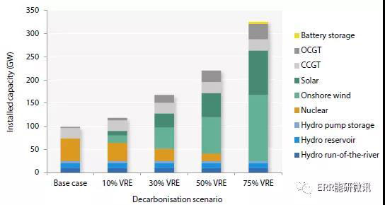 美國能源部的研究表明,將明確的VRE技術(shù)目標(biāo)與嚴(yán)格的碳排放限制結(jié)合起來,對發(fā)電組合的構(gòu)成及其成本具有重要影響。特別是,總裝機(jī)容量隨著VRE的部署而顯著增加。由于VRE的負(fù)荷因數(shù)和容量。
