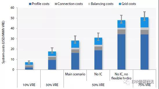 風(fēng)能和光伏發(fā)電占比50%的系統(tǒng)成本為,每MWh的成本為50美元。成本的變化是與鄰國水電資源的靈活度相關(guān)。雖然這種估計(jì)有一定程度的不確定性,但其數(shù)量級為政策選擇提供了明確的指示。