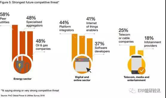 許多電力行業(yè)以外的企業(yè)都在關(guān)注這些機會,包括在線、數(shù)字和數(shù)據(jù)管理領(lǐng)域的企業(yè)。這些新的競爭對手越來越受到現(xiàn)有電力公司的關(guān)注。但在我們的調(diào)查參與者看來,他們在競爭威脅方面的排名仍然低于能源企業(yè)(圖5)。在我們的調(diào)查中,約有一半的高管認(rèn)為能源行業(yè)的競爭對手是更大的威脅。他們對來自油氣公司的競爭表示了相當(dāng)程度的擔(dān)憂,反映了一些石油巨頭最近進(jìn)軍電力行業(yè)的舉措所產(chǎn)生的影響。
