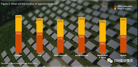 判斷轉(zhuǎn)型的速度是一個關(guān)鍵的挑戰(zhàn)。改革的時機和重點都因世界各地的當(dāng)?shù)厥袌龆悺T谝恍┦袌觯谢l(fā)電的經(jīng)濟效益已經(jīng)受到重創(chuàng),上游和下游都受到了沖擊。在其他市場,變革的重點通常是下游。縱觀各地區(qū),為能源轉(zhuǎn)型的窗口期在歐洲關(guān)閉得最快,在中東和非洲關(guān)閉得最慢。但即便是在中東和非洲,絕大多數(shù)國家也認(rèn)為,關(guān)鍵時刻只剩下5年時間。這也是全球行業(yè)從業(yè)者的共識。