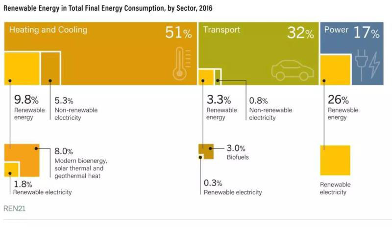 根據REN21匯總的數據,在全球范圍內2016年供熱(冷)占全球能耗的51%,在供熱(冷)能耗中可再生能源僅9.8%(現代生物質、太陽能、地熱等8.0%,可再生能源電力占1.8%)。同年全球交通能耗占總能耗的32%,交通能耗只有3.3%來自可再生能源(3.0%生物燃油、0.3%可再生能源電力)。而在發(fā)電領域,可再生能源發(fā)電占比已經達到26%。