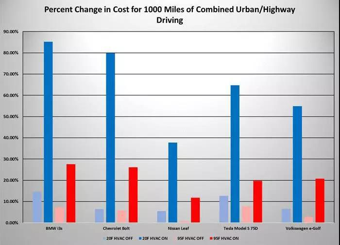 在溫差 75°F(約 41.7°C)情況下測(cè)試,1,000 英里(1,600 公里)城市及高速公路綜合工況下成本變化百分比。