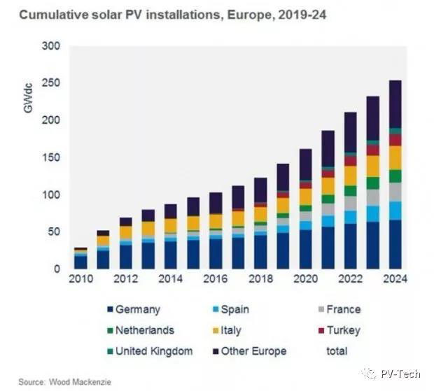 Wood Mackenzie預(yù)計(jì),德國(guó)仍是無(wú)可爭(zhēng)議的歐洲光伏領(lǐng)袖。2019年至2024年,德國(guó)計(jì)劃開(kāi)發(fā)20GW項(xiàng)目,之后一年,累計(jì)裝機(jī)量會(huì)超過(guò)65MW。