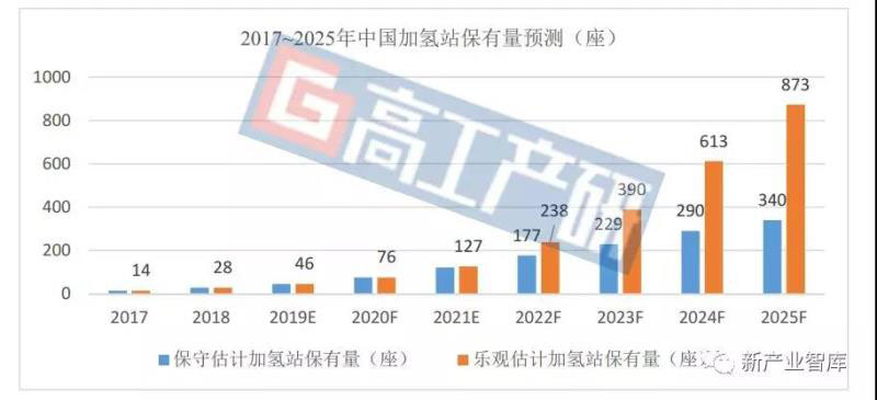高工產(chǎn)研氫電研究所(GGII)預(yù)計,2020年中國加氫站的保有量將會達到76座,2025年中國加氫站的保有量在340~873座之間。