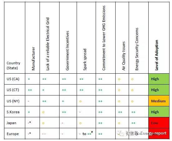 在下面的表2中,總結(jié)了上文討論的關(guān)鍵地區(qū)采用大型固定燃料電池的主要驅(qū)動(dòng)因素,以及每個(gè)地區(qū)的主觀評(píng)級(jí),表明了這一驅(qū)動(dòng)因素對(duì)技術(shù)應(yīng)用的正面或負(fù)面影響。值得注意的是,驅(qū)動(dòng)因素特別針對(duì)的是大規(guī)模燃料電池的實(shí)施,而不是其他燃料電池的應(yīng)用(例如,日本的政府激勵(lì)措施對(duì)大型固定燃料電池的實(shí)施支持力度較低,但它大力支持微型燃料電池的推廣應(yīng)用)。