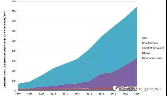 圖2 自2007年以來大型固定式燃料電池的累計(jì)全球部署(部署數(shù)據(jù)從2000年開始考慮),按地區(qū)分類