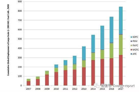 圖1 自2007年以來大型固定式燃料電池累計(jì)全球部署(部署數(shù)據(jù)從2000年開始考慮),按技術(shù)分類