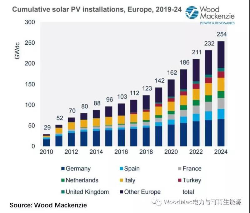 根據(jù)Wood Mackenzie(伍德麥肯茲)電力與可再生能源的最新研究《歐洲光伏市場(chǎng)展望》,在經(jīng)歷了多年的光伏安裝容量低迷后,預(yù)計(jì)歐洲新增光伏容量將于未來(lái)3年內(nèi)實(shí)現(xiàn)翻番,達(dá)到約每年新增20GW 年的水平,裝機(jī)總?cè)萘繉⒊^(guò)250GW。