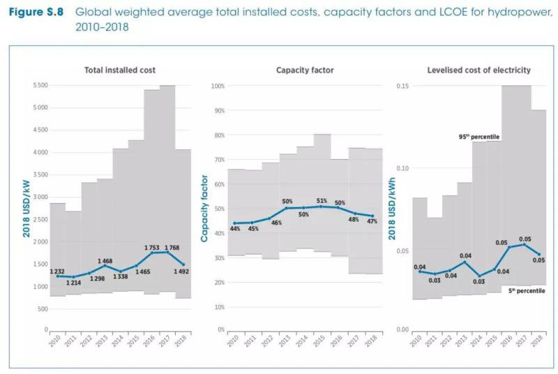 國際可再生能源署發(fā)布最新的可再生能源發(fā)電成本報告,2010-2018年全球水電項(xiàng)目加權(quán)平均的單位投資成本、容量系數(shù)、平準(zhǔn)化成本走勢如下(以2018年美元計(jì)):