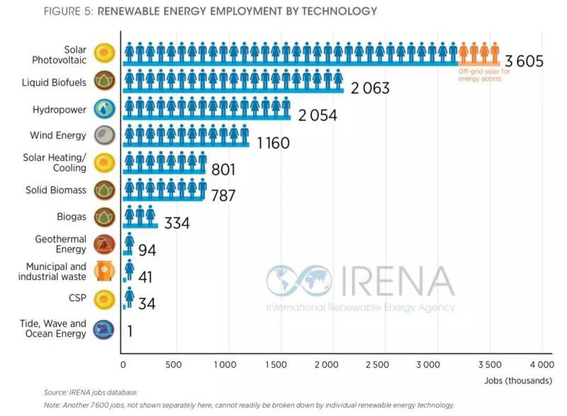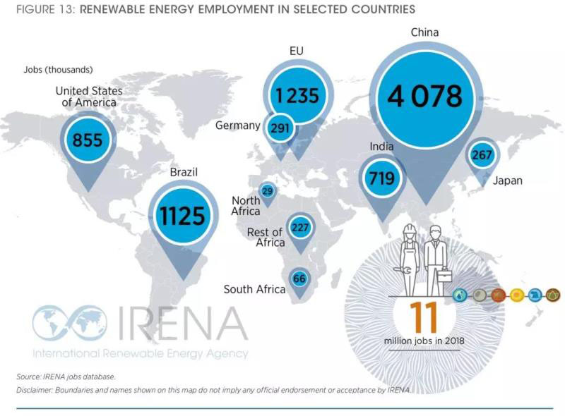 根據(jù)國(guó)際可再生能源署發(fā)布的最新報(bào)告,2018年全球范圍內(nèi)在可再生能源領(lǐng)域內(nèi)就業(yè)人數(shù)達(dá)到1098萬(wàn)人,包括太陽(yáng)能361萬(wàn)人、生物質(zhì)能318萬(wàn)人、水電205萬(wàn)人、風(fēng)電116萬(wàn)人、太陽(yáng)能熱水/制冷80萬(wàn)人以及其他可再生能源18萬(wàn)人。
