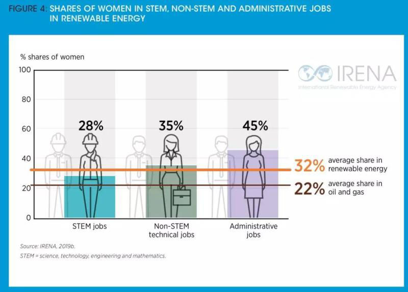 從可再生能源領(lǐng)域就業(yè)人員的性別比例來(lái)看,其中32%是女性(油氣領(lǐng)域只有22%是女性)。