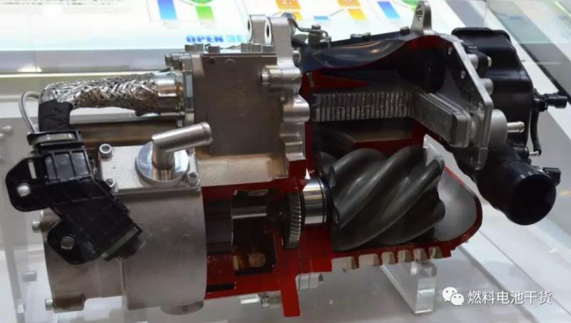 燃料電池電化學反應的進行需要空氣中氧氣參與??諌簷C的作用是將空氣源源不斷的輸送到電堆入口并增壓。豐田自動織機開發(fā)六葉螺旋羅茨空壓機,通過在高低負荷間調節(jié)氣體壓力實現(xiàn)效率提升。與豐田2008年FCHV-adv款燃料電池汽車相比,低負荷時效率提高14%,高負荷時效率提高20%。(感興趣的讀者可以關注“燃料電池干貨”公眾號,將分幾期推送豐田工程師告訴你如何開發(fā)Mirai空壓機的故事)