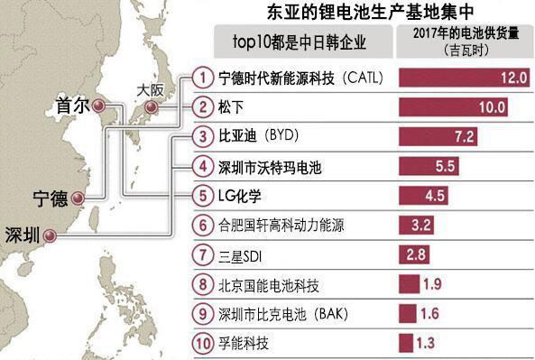 根據(jù)中國調(diào)查公司高工產(chǎn)業(yè)研究院(GGII)在2017年匯總的調(diào)查報(bào)告,中日韓三國企業(yè)壟斷了全球車載鋰離子電池供貨量排行榜前十。寧德時(shí)代新能源科技(CATL)以12吉瓦時(shí)排在榜首,該公司除向德國寶馬、德國大眾供應(yīng)電池外,2019年2月還宣布與本田進(jìn)行共同研發(fā)。
