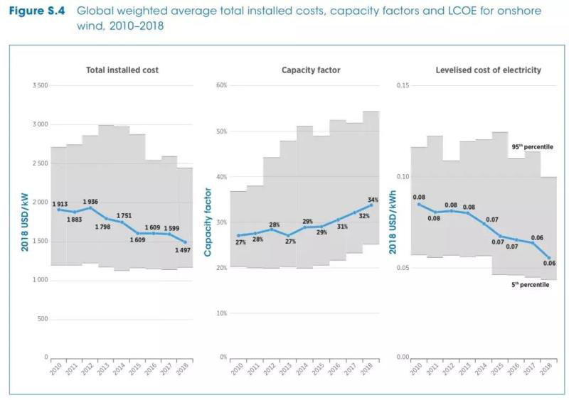 國際可再生能源署發(fā)布最新的可再生能源發(fā)電成本報(bào)告,2010-2018年全球陸上風(fēng)電項(xiàng)目加權(quán)平均的單位投資成本、容量系數(shù)、平準(zhǔn)化成本走勢如下(以2018年美元計(jì)):