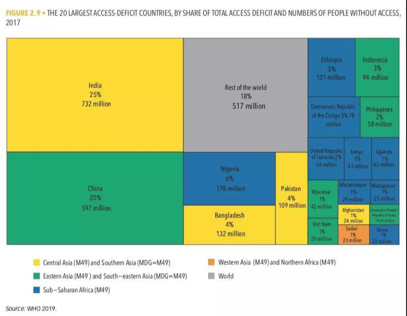 2017年底未能使用清潔燃料做飯的人口最多的20個(gè)國(guó)家是:1)印度(7.32億);2)中國(guó)(5.97億);3)尼日利亞(1.78億);4)孟加拉(1.32億);5)巴基斯坦(1.09億);6)埃塞俄比亞(1.01億);7)印度尼西亞(9400萬(wàn));8)民主剛果(7800萬(wàn));9)菲律賓(5800萬(wàn));10)坦桑尼亞(5600萬(wàn));11)肯尼亞(4300萬(wàn));12)烏干達(dá)(4200萬(wàn));13)緬甸(4200萬(wàn));14)越南(2900萬(wàn));15)莫桑比克(2900萬(wàn));16)馬達(dá)加斯加(2500萬(wàn));17)阿富汗(2400萬(wàn));18)蘇丹(2300萬(wàn));19)朝鮮(2200萬(wàn));20)加納(2200萬(wàn));其余國(guó)家(5.17億)。