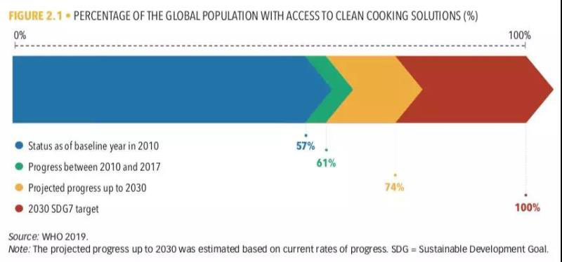根據(jù)世界銀行ESMAP最新公布的數(shù)據(jù),全球使用清潔燃料做飯的人口比例從2010年的57%增加到2017年的61%,2017年全球未能使用清潔燃料做飯的人口仍有29億,僅比2010年(29.6億)略有下降?;谀壳暗内厔?shì)和人口預(yù)測(cè),到2030年使用清潔燃料的人口比例約為74%,大約仍有22億人將無(wú)法使用清潔燃料做飯。因此,聯(lián)合國(guó)在2030年實(shí)現(xiàn)全部人口使用清潔燃料做飯的可持續(xù)目標(biāo)將無(wú)法實(shí)現(xiàn)。