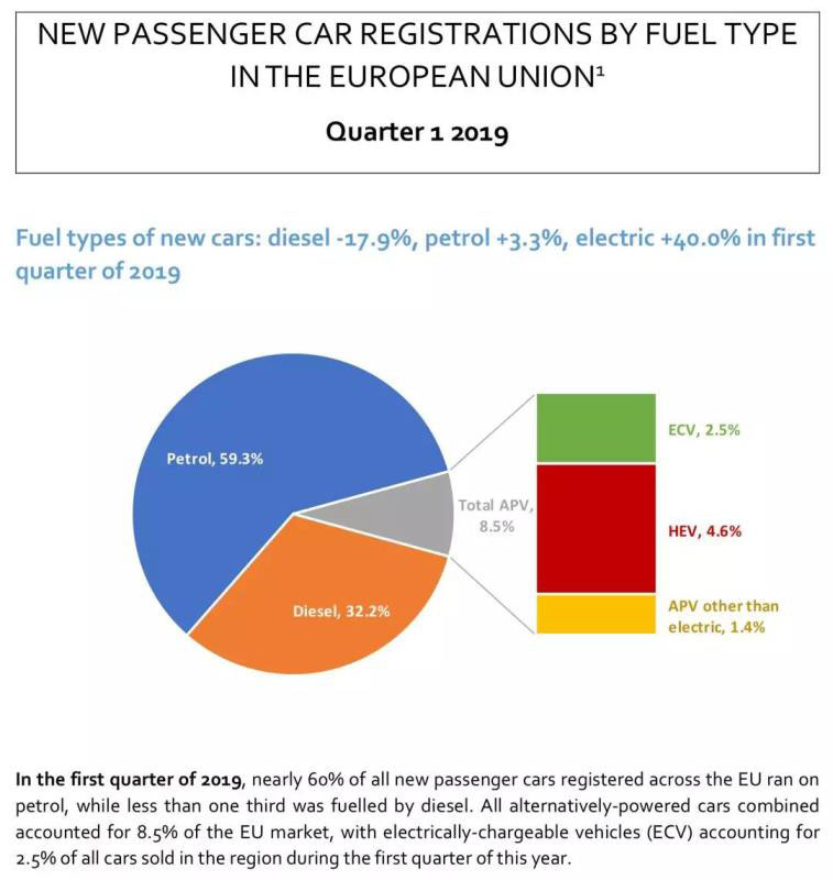 根據(jù)歐洲汽車制造業(yè)協(xié)會(huì)(ACEA)的數(shù)據(jù),2019年第一季度歐盟國(guó)家共售出99,174輛(其中全電動(dòng)汽車61,789輛、插電混動(dòng)37,385輛),比2018年第一季度增長(zhǎng)40%,但是只占同期歐盟汽車市場(chǎng)的2.5%。汽油車仍在市場(chǎng)占絕對(duì)優(yōu)勢(shì),占比59.3%;柴油車占比32.2%;混動(dòng)車占比4.6%。