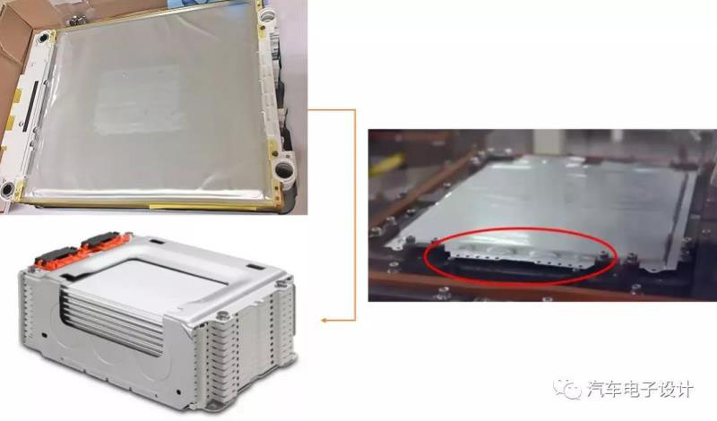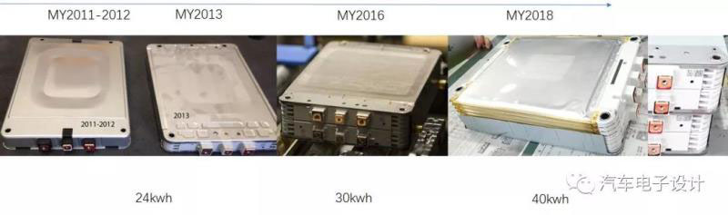 從第一代LEAF的模組開始,結(jié)構(gòu)上做了很多的改進,前面的設(shè)計都是考慮以半封閉的金屬殼體內(nèi)以2P2S的方式成組放置4個電芯,在做30kWh的模組的時候,在模組的側(cè)面開了較大的口,容納下8個電芯,相當于兩個封在了一起。